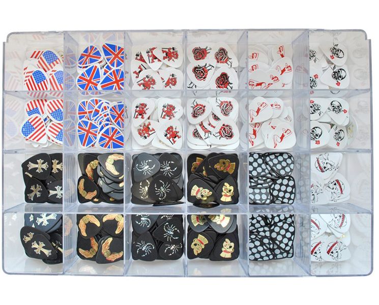Виды рисунков: Американский флаг, Британский флаг, Роза, Красный чертик, Крест, Скорпион, Череп, Крылья, Пинап-девушка, Череп с розой, В горошек, Череп с костями (12 рисунков, по 50 медиаторов)