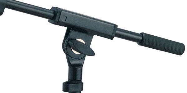 Верхняя часть низкой микрофонной стойки имеет дополнительное плече с несколькими фиксаторами длины и положения в виде нескольких зажимных и стопорных винтов. На некоторых моделях стоек также используется дополнительная стопорная защелка. Угол наклона плеча можно регулировать и фиксировать при помощи специального зажимного элемента. Длина дополнительного плеча может изменяться в пределах от 425 мм. до 725 мм. Все элементы стойки легко регулируются одним человеком. В качестве прочных фиксаторов положения и длины выдвигающихся частей используются прочные стальные зажимные и стопорные винтовые механизмы при помощи которых можно быстро изменить высоту стойки и зафиксировать ее положение. Все элементы крепления с легкостью закручиваются руками без использования дополнительного оборудования.