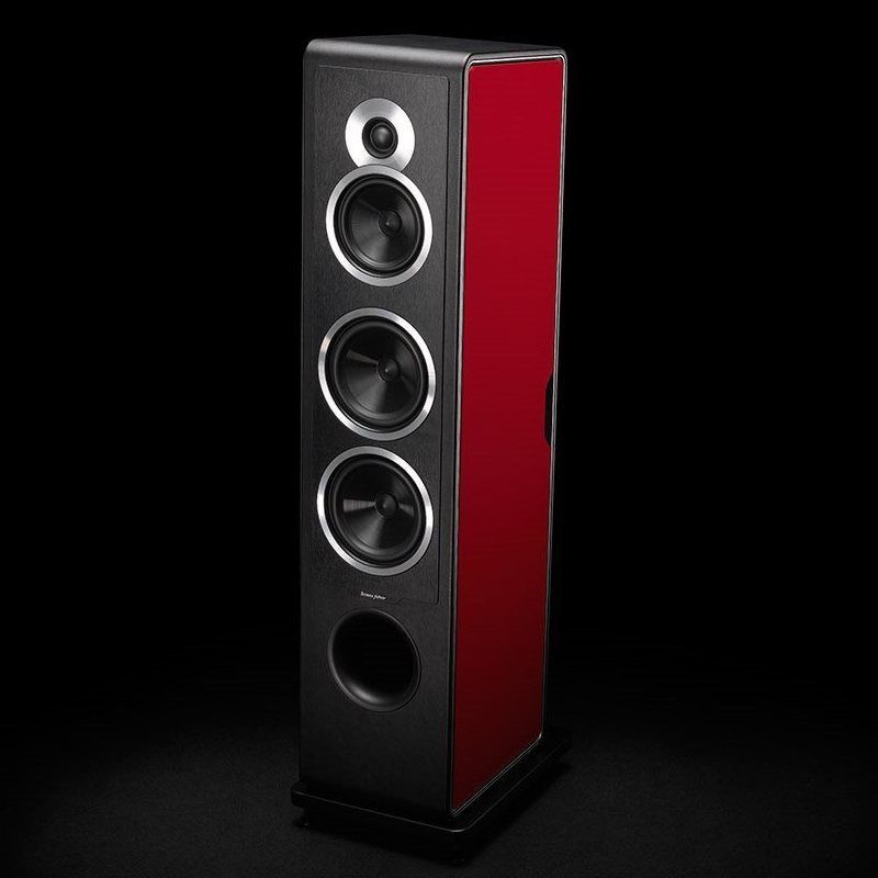 Sonus Faber Chameleon T Red, Сохраняя ряд традиционных элементов оформления, таких как кожаная отделка передней панели, округлые ребра и трапециевидные боковые поверхности, новая серия Sonus Faber Chameleon выглядит солидной и современной, с усиливающими алюминиевыми вставками под фланцы динамиков.