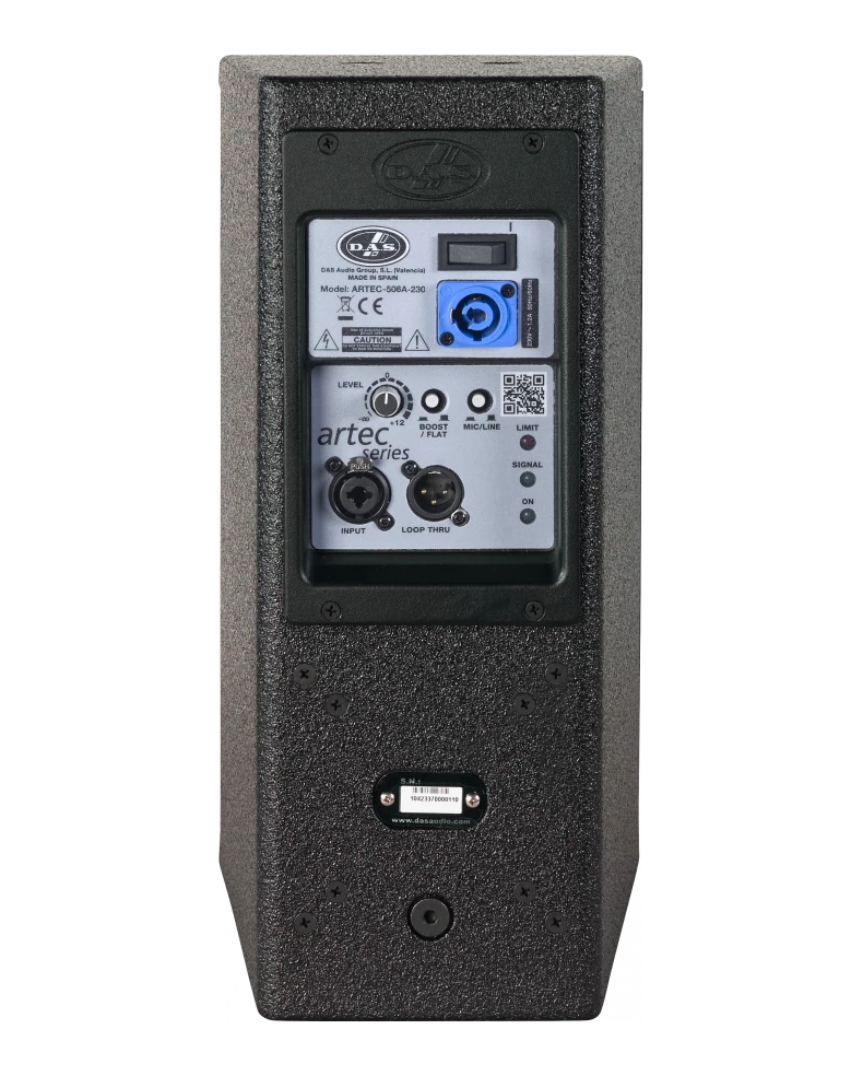 Das Audio Artec-506A - компактная активная акустическая система. Высокочастотный компрессионный драйвер M-34 с титановой диафрагмой нагружен на осесимметричный рупор. За воспроизведение НЧ диапазона отвечает фирменный динамик 6P. Встроенный цифровой усилитель обеспечивает стабильную выходную мощность, широкий динамический диапазон и низкий уровень искажений, что редко встречается в данном сегменте рынка. На задней панели расположены: регулятор уровня сигнала, входной разъем XLR, переключатель чувствительности входа MIC/LINE, выходной разъем XLR для подключения дополнительной акустической системы. Также имеются светодиодные индикаторы состояния, дополнительный переключатель BOOST/FLAT, разъем для подключения питания, кнопка включения/выключения. Корпус изготовлен из легкой и чрезвычайно прочной березовой фанеры Wisa®. Обработан износостойким покрытием и имеет несколько точек подвеса М10. Данная модель является готовым портативным решением звукоусиления и подходит для использования в аудиториях, барах и ресторанах.