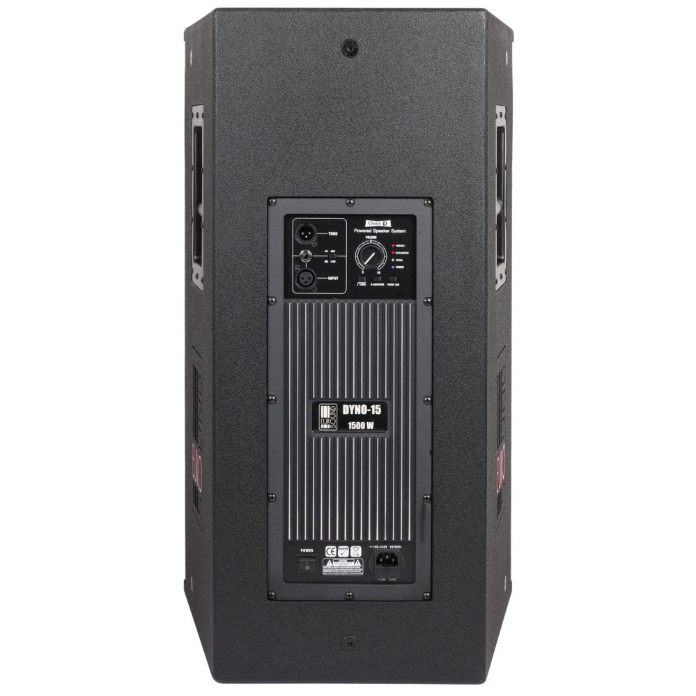 Eurosound DYNO-15 – активный двухполосной концертный громкоговоритель серии DYNO, содержащий в себе встроенный процессор DSP с эквалайзером и кроссовером, усилители мощности класса D (используется технология двойного усиления bi-amp, при которой отдельно усиливаются сигналы на нижние и все остальные частоты), а также системы защиты как от перегруза, так и от влияния окружающей среды.