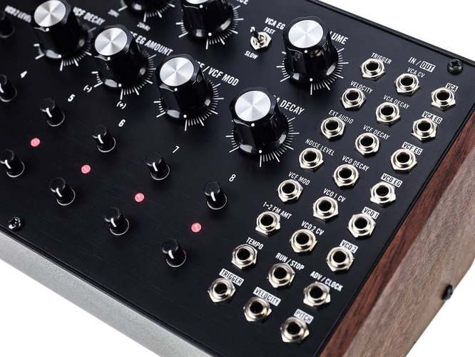 Активированный простым в использовании аналоговым секвенсором, эмоциональный звук DFAM начинается с генератора белого шума и двух широкополосных аналоговых генераторов - легко переключаясь между ритмическими пульсациями, звучанием низких и резонансных звуков в одно мгновение. Отличительный голос DFAM затем формируется классическим фильтром Moog Ladder с двумя выбираемыми режимами: режим низких частот придает удар и размерность каждому звуку, к которому он прикасается, а режим высоких частот открывает двери для естественных выразительных ударов, всплесков и клановых акцентуаций.