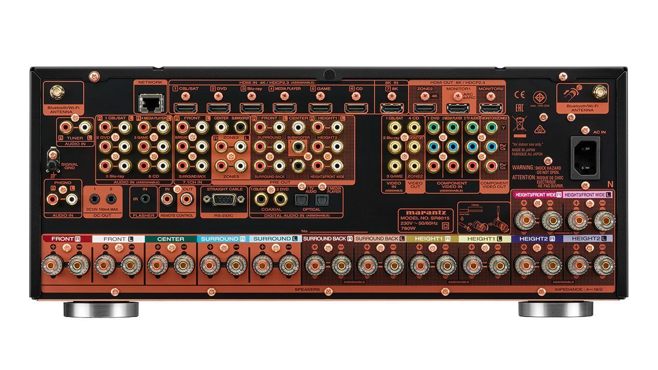 Модель Marantz SR8015 получила восемь HDMI-входов (один на фасаде), которые поддерживают разрешение 8K/60 Гц, 4K/120 Гц, протокол HDCP 2.3, BT.2020, пропускают HDR-видео, HLG (версия HDR для телетрансляций) и Dolby Vision. Есть три выхода HDMI, один из которых работает с eARC (расширенный канал возврата), что позволяет транслировать Dolby Atmos, DTS:X и другие форматы 3D-аудио. Также можно выделить группу цифровых входов, вход MM-фонокорректора, 7.1-канальный вход и 11.2-канальный Pre Out. Для подсоединения АС имеются двенадцать пар винтовых терминалов.