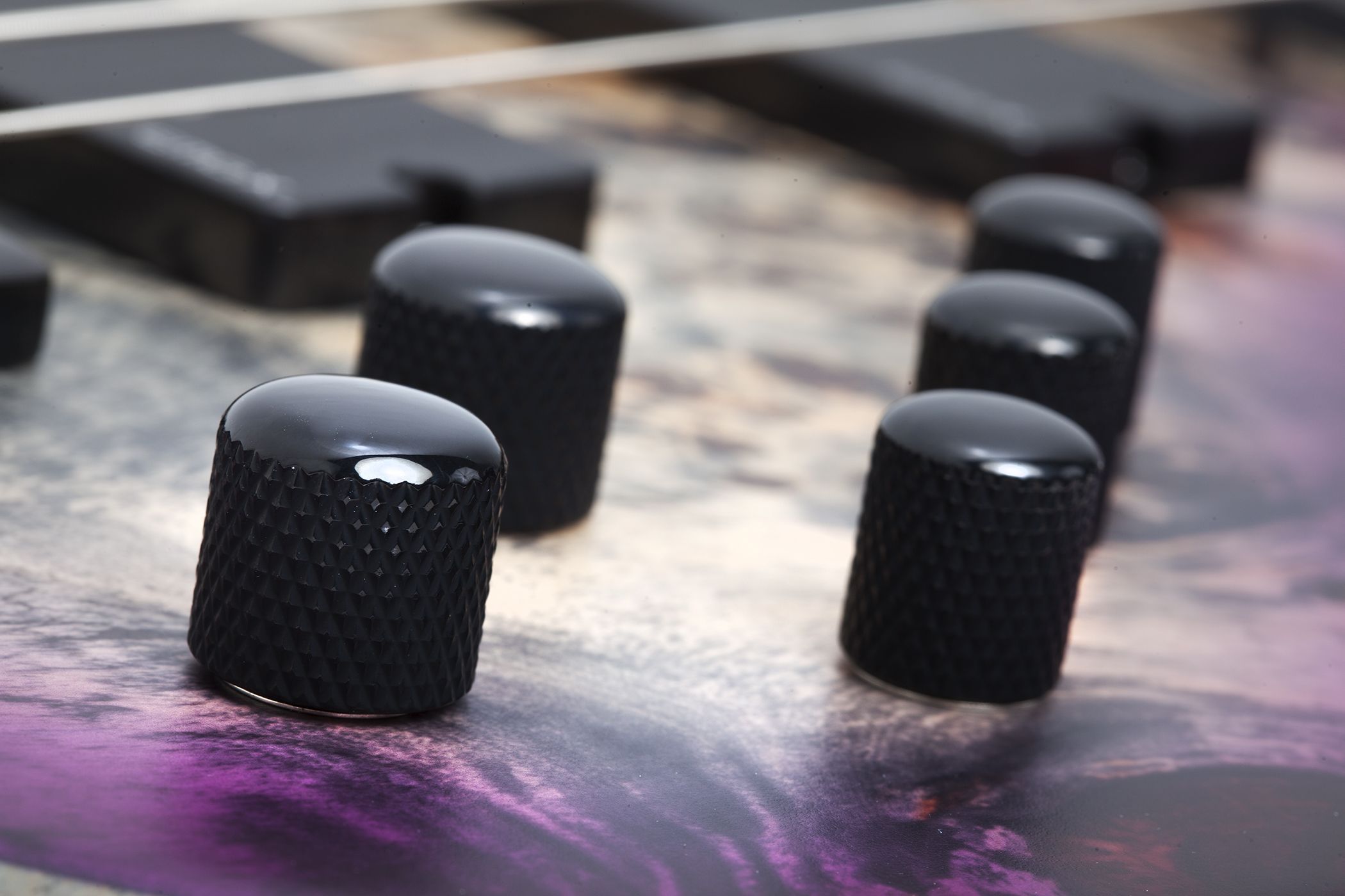 Инструмент Schecter Riot-4 выполнен в корпусе из болотного ясеня с топом из капа (наплыв на дереве), с грифом, выполненным из клена и многослойного ореха с накладкой из черного дерева. Оснащен звукоснимателями EMG-35, которые обладают высокой выходной мощностью.