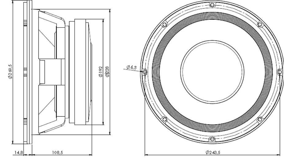 Диаметр 25 см (10"), сопротивление 8 Ом, мощность 350 Вт, чувствительность 101 дБ, полоса пропускания 70 - 4000 Гц