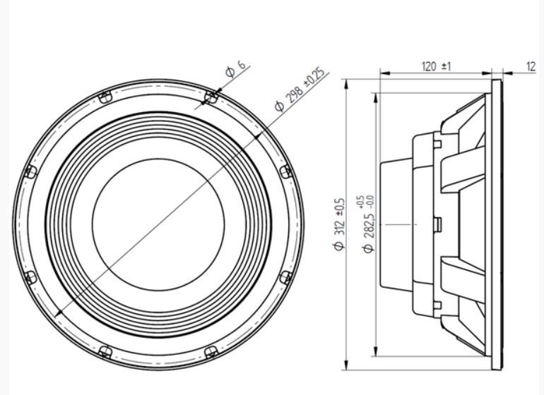 Диаметр 30 см (12"), сопротивление 8 Ом, мощность 1200 Вт, чувствительность 96 дБ, полоса пропускания 25 - 1800 Гц