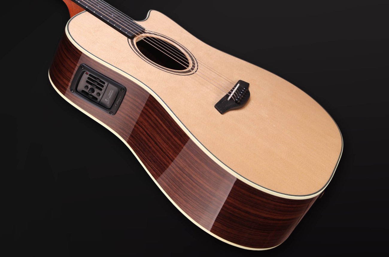 Верхняя дека выполнена из массива ситхинской ели. Нижняя дека и обечайка - из массива индийского палисандра. Нижняя дека выпуклая, без пружин, что дает дополнительный резонанс. Комбинация древесины, отделки из ореха и слоновой кости, глянцевое покрытие придают инструменту не только стильный внешний вид, но и прекрасное насыщенное звучание по всему диапазону.
