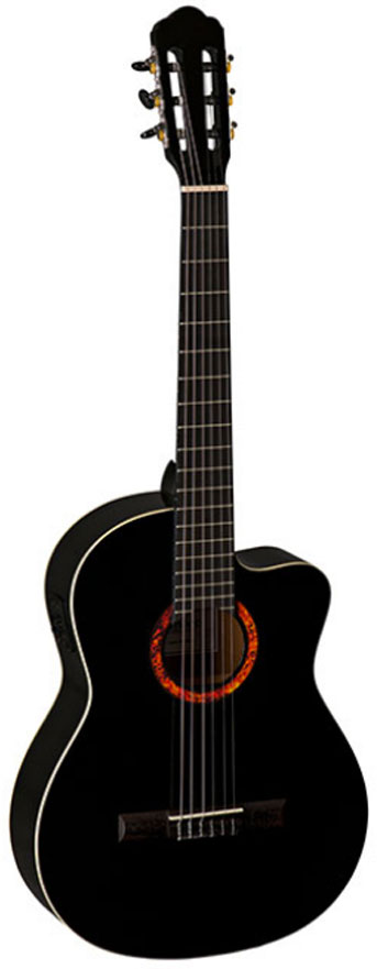Электроакустическая гитара Romero La Mancha Lava 42 CE-N – это недорогой и качественный инструмент. Верхняя дека выполнена из ели. Нижняя дека и обечайки сделаны из красного дерева, а накладка и бридж – из твёрдой и плотной африканской древесины овангкол. La Mancha Lava оснащена системой звукоснимателя BR-1 с двухполосным эквалайзером и тюнером. Кроме того, гитара имеет удобный вырез, ширину порожка грифа всего 48 мм и струны Savarez в комплекте. А эффектности этой модели добавляет алая розетка резонаторного отверстия ярко выделяющаяся на чёрном корпусе.