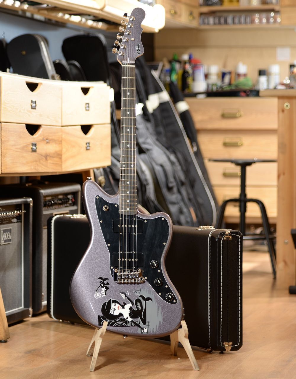 Графитовая русалка – примерно так можно перевести название окраски гитары. За названием стоит такая история: как-то Ларри Спирс (он отвечает за менеджмент в G&L Musical Instruments) совместно со своим товарищем Сили Собески (он свободный художник) выпивали в а-ля полинезийском тики-баре, и им там понравилось. Сили близка стилистика Полинезии, он даже жил на Гаваях, и он нарисовал для жены Ларри русалочку с коктейлем в руке. Получилось классная русалочка, но уж больно строгая и неприступная – и пришлось Сили нарисовать ещё одну, совсем не строгую, да и не русалку уже, а мечтательную девушку-танцовщицу с укулеле. И решили тогда выпустить лимитированную серию Doheny, всего 60 гитар: для строгой русалки – графитового цвета, для нестрогой девушки – Miami Blue. Каждую из них для этой лимитированной версии Doheny Tiki Limited Edition Сили Собески нарисовал на корпусе вручную. А жена Ларри велела повесить картину с русалочкой в гостиной.