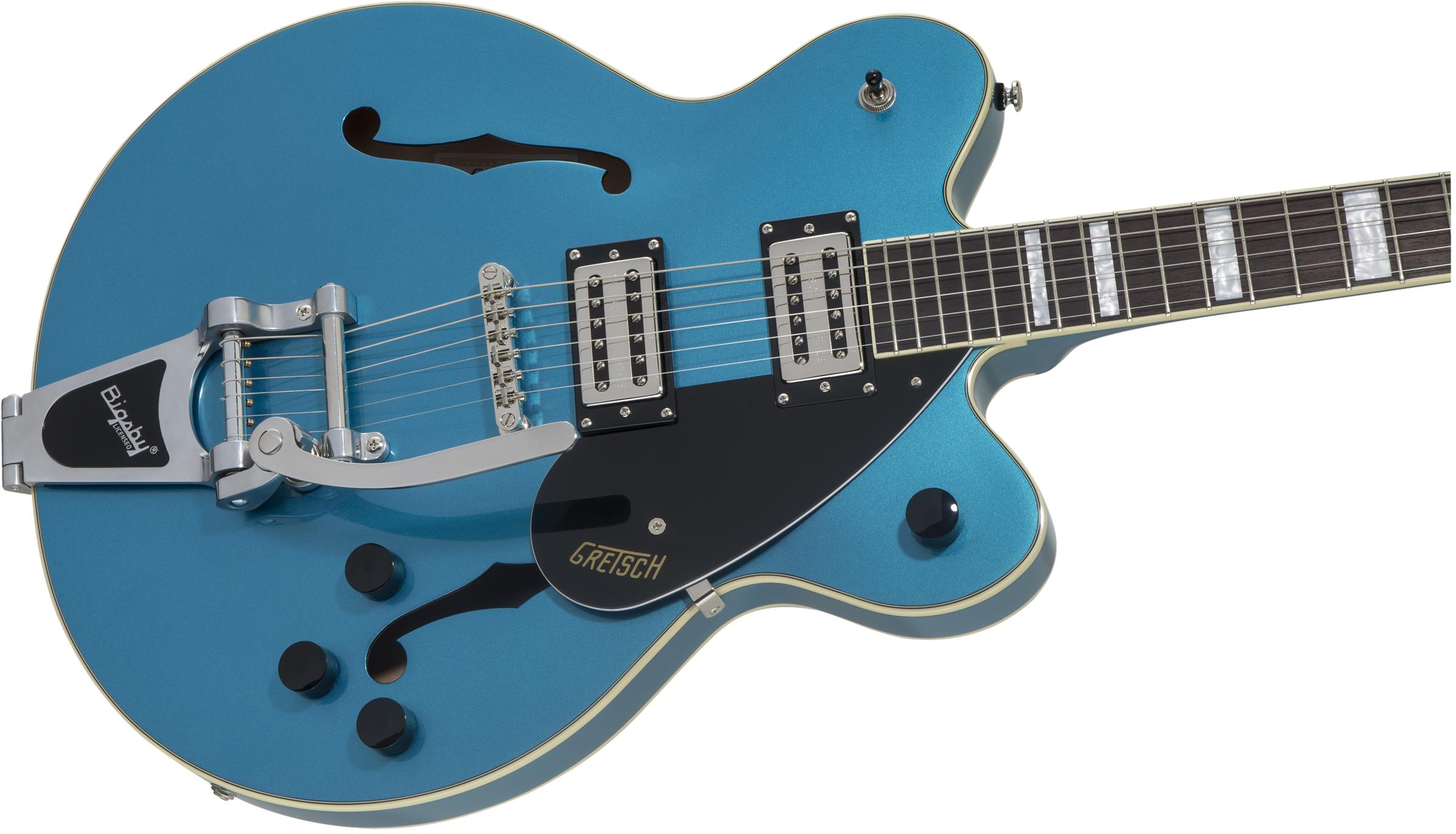 GRETSCH G2622T STRML CB DC RVBL – современная полуакустическая электрогитара, специально созданная для гитаристов, которые всегда стремятся к большему: большей производительности и в первую очередь большей громкости. Она выполнена из высококачественных материалов и комплектующих, элегантно выглядит, оснащена улучшенной электроникой и выдаёт великолепный узнаваемый звук Gretch. Особенности представленной модели Streamliner Center Block – это новейшие хамбакеры Broad'Tron™ собственной разработки инженеров Gretch, сконструированные специально для этой гитары, и центральное ребро из лёгкой сосны, укрепляющее верхнюю деку гитары и позволяющее избежать нежелательной обратной связи при игре на высокой громкости. Broad'Tron - это звукосниматель с высоким выходным уровнем, выдающий уникальный звук благодаря сочетанию мощных густых низов, чистых и прозрачных верхних частот, хрипловатой середины. Переключатель – 3-позиционный. В дополнение к регуляторам тембра и общего уровня громкости предусмотрены отдельные регуляторы громкости для каждого из звукоснимателей. Корпус гитары формы Streamliner Center Block с двумя вырезами выполнен из ламинированного клена. Гриф удобного для быстрой игры профиля Thin "U" – из древесины нато, с глянцевой отделкой и белой окантовкой. Мензура – 629 мм (24.75 дюйма). Накладка – палисандровая, радиус – 12 дюймов (305 мм). На грифе 22 лада Medium Jumbo с инкрустацией перламутровыми прямоугольниками. Порожек выполнен из искусственной кости. Палисандровый бридж Adjusto-matic™ обеспечивает надежность строя, а тремоло Bigsby B70 даёт широкие возможности для экспрессивной игры. Инструмент элегантно выглядит в изящном полом корпусе яркого светло-синего цвета с винтажными золотыми регуляторами, двухслойной черно-белой окантовкой корпуса, обтекаемой никелированной фурнитурой и черным пикгардом с логотипом Gretch.