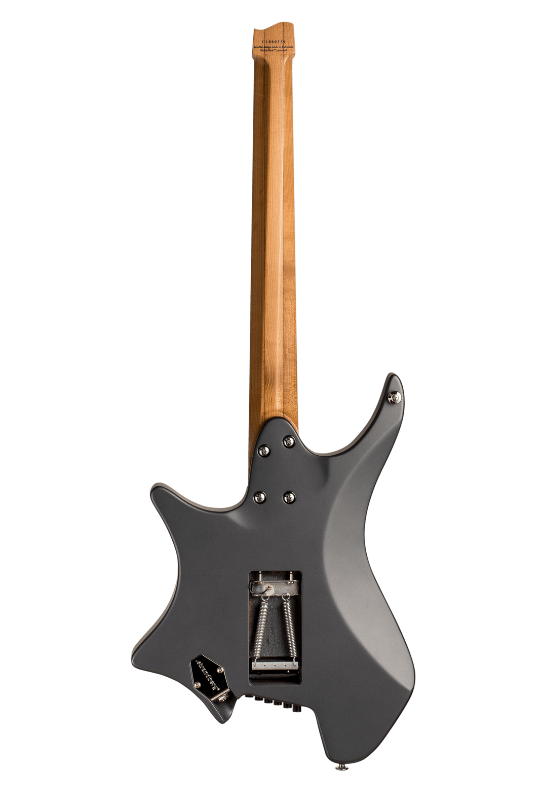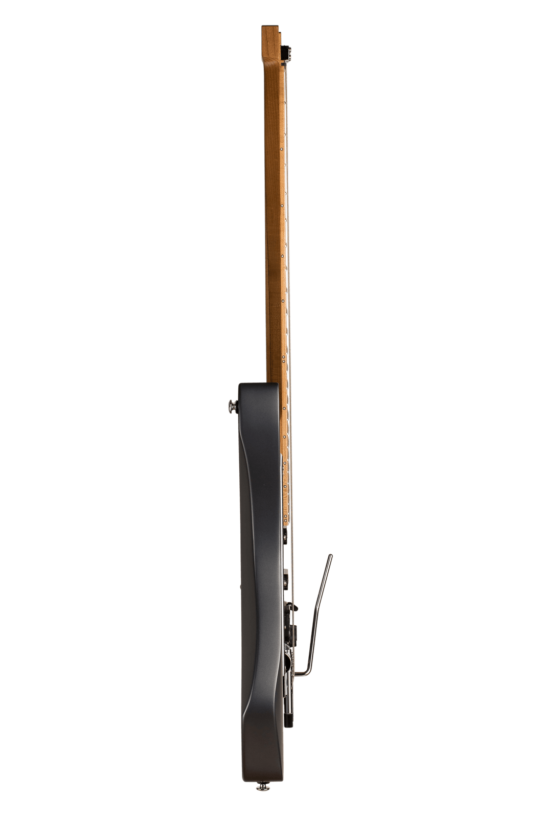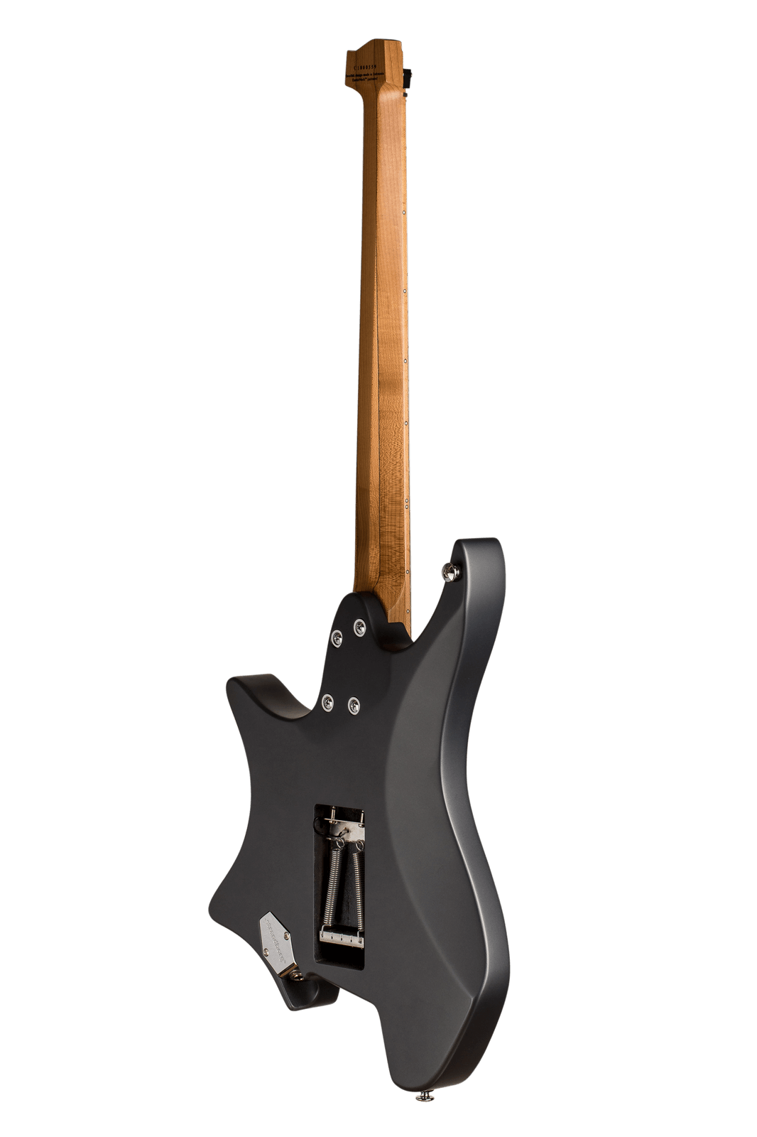 - Стильная многогранная электрогитара без головы выполнена в цвете графит