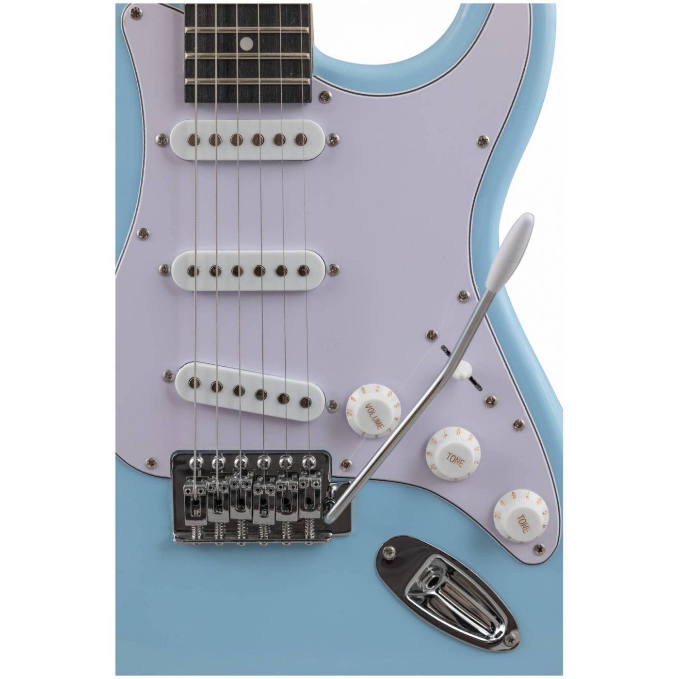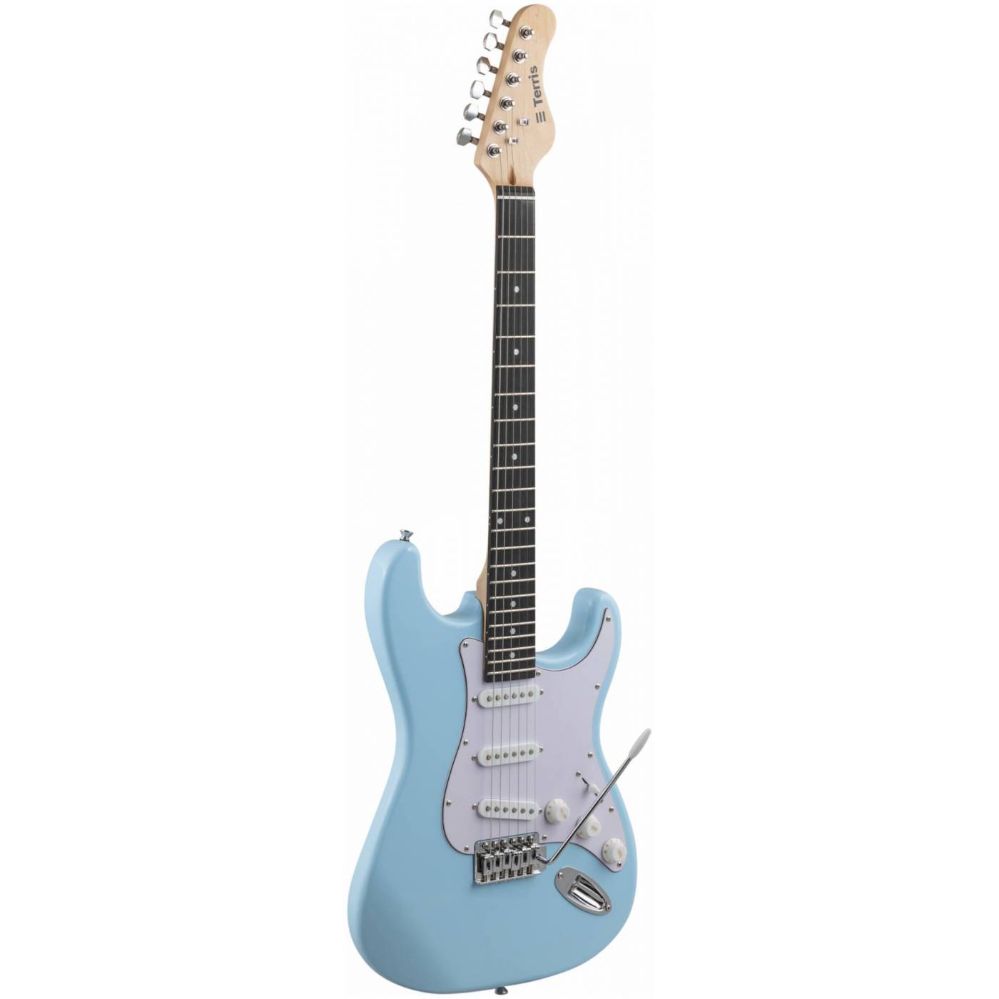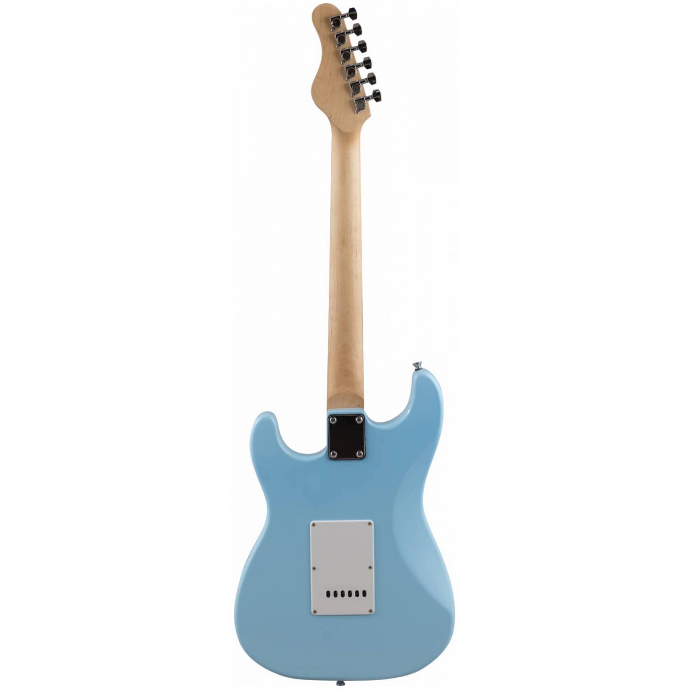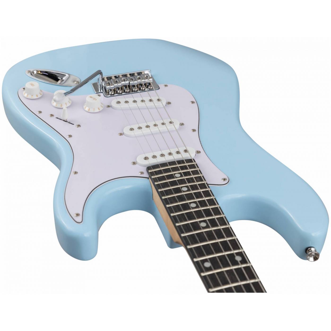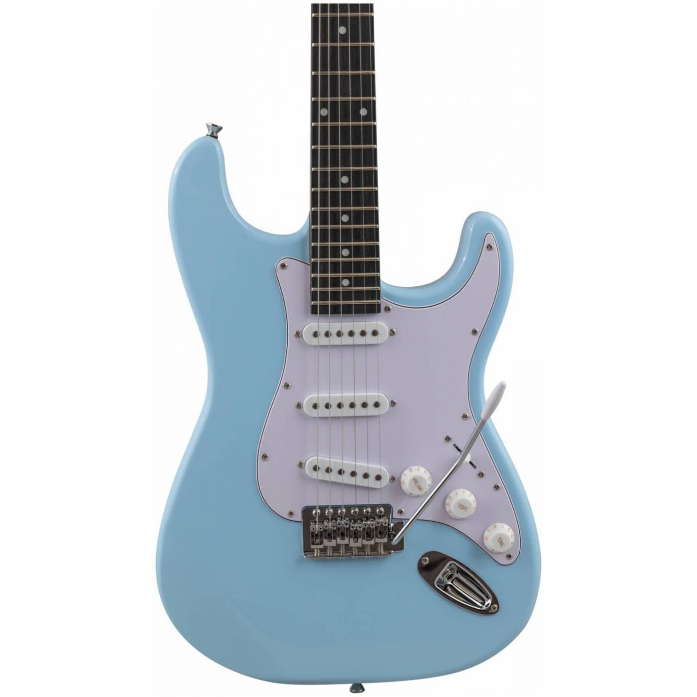 Электрогитара имеет стильный и легко узнаваемый дизайн в стиле Stratocaster, который подойдет для игры в любом жанре. Корпус гитары сделан из тополя, что обеспечивает стабильность инструмента. Гриф из клена и накладка из техновуда обеспечивают комфортную игру на электрогитаре в течение долгого времени. Конфигурация звукоснимателей: три звукоснимателя сингл(ceramic). Электроника: 1 регулятор громкости и 2 тона, 5-позиционный переключатель. Бридж: тремоло 6 болтов. Лады: 22 шт, 2.7. Мензура: 648 mm/25.5". Анкер двойного действия. Хромированная колковая механика. Колки расположены в один ряд.