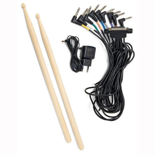 - Включает стойку барабана, педаль, блок питания, кабели и палки