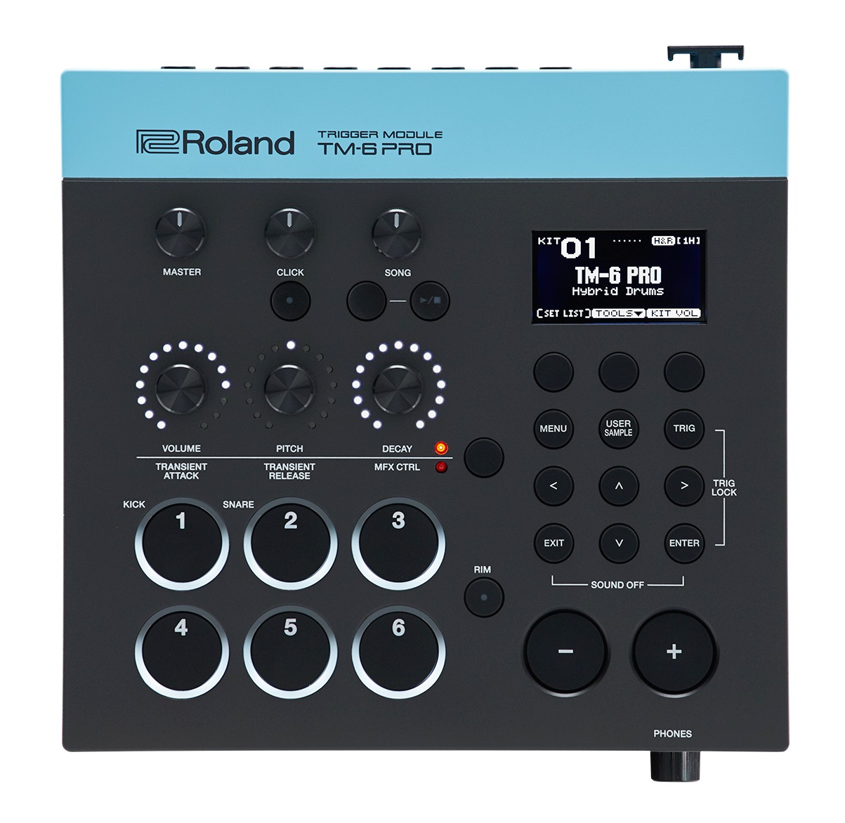 Roland TM-6 Pro Drum Trigger Module – триггерный модуль для гибридной барабанной установки. Предлагается 100 наборов ударных, 268 пресетов инструментов и 500 семплов, записанных в известнейших студиях, таких как Real World и Rockfield. Это звуки акустических ударных инструментов и электронные, включая «жирную» синтезаторную бочку, классические драм-машины, хлопки и звуковые эффекты (SFX). Кроме того, есть обработанные процессорами тембры, например, компрессированные бочки или малые барабаны, а также отдельные фазы звука. Последние позволяют акцентировать атаку малого барабана и добавить низких частот бочке.
