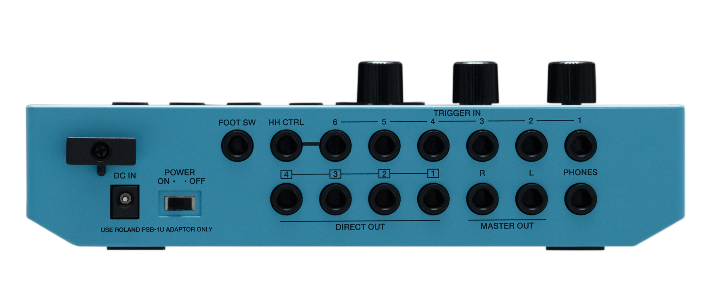 - Разъемы: 6 триггерных входов на джеках 1/4 дюйма TRS phone, стереоджек phone 1/4 дюйма, мастер-выходы (L и R) на 1/4 дюйма разъемах phone, 4 выхода Direct на 1/4 дюйма разъемах phone, HH CTRL на 1/4 дюйма разъеме phone, FOOT SW на 1/4 дюйма TRS разъеме phone, выход MIDI, порт USB B.