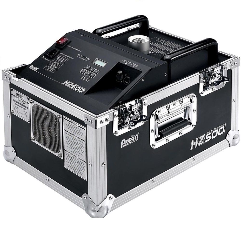 Hazer – это прибор, создающий довольно «тонкий» эффект прозрачной «долгоживущей» дымки, которая чаще называется – туман. С одной стороны эта дымка почти не мешает видеть происходящее на сцене даже с большого расстояния, с другой стороны, свет лазеров и других световых приборов в ней прекрасно «материализуется» в объёмные фигуры. Принципиальное отличие от дым-машины состоит в том, что Hazer не имеет термоэлемента, и аэрозоль распыляется воздухом, который подаётся в бак с невоспламеняющейся жидкостью под огромным давлением при помощи мощного компрессора. HZ-500 – это HZ-400 упакованный в кейс для транспортировки, что служит идеальным решением для туровой работы. Управляется машина от встроенного контроллера с информационным ЖК дисплеем и таймером и по протоколу DMX.