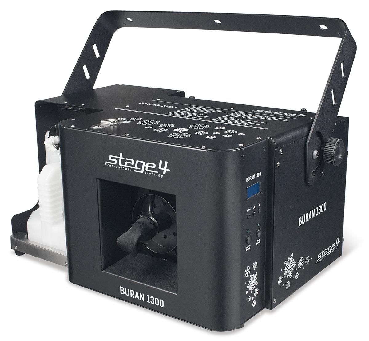 STAGE4 - BURAN 1300. Генератор сценического снега. Мощность 1300 Вт, опциональный проводной ПДУ, расход жидкости: 263 мл/мин, лира для подвеса, габаритные размеры (ШхВхГ), 670×491×550мм, масса: 13,5кг.