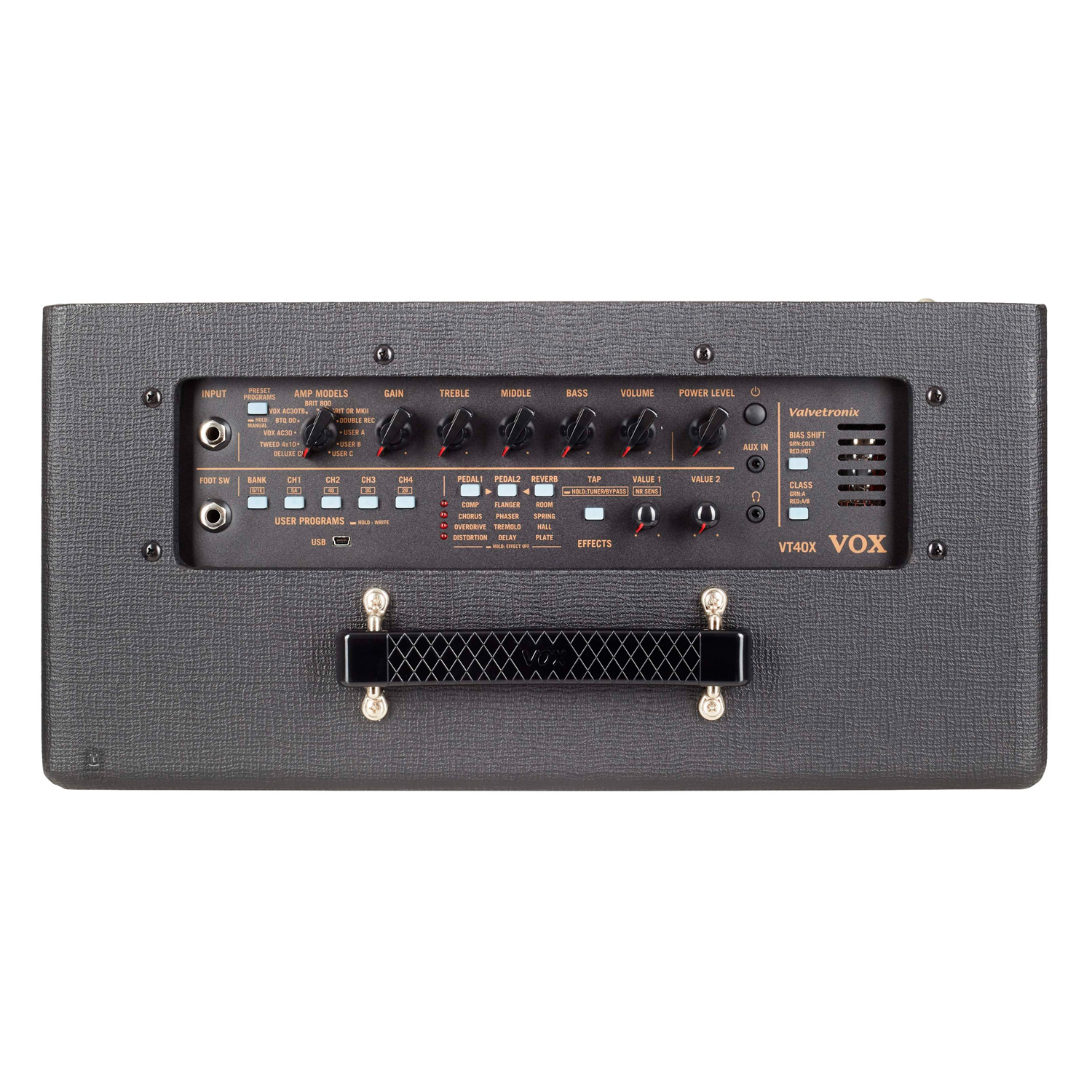 VOX VT40X разработан по новой схеме моделирования при использовании VET (Virtual Element Technology), которая основана на анализе компонентов и схем усилителей. VTX усилители производят самое точное и реалистичное усиление звука на сегодняшний день. Эти новые усилители также снабжены Valvetronix ламповым многоступенчатым предусилителем. Эта конструкция включает в себя аналоговые схемы предусилителя для достижения тонких тональных поправок и захвата нюансов, которые являются отличительными для ламповых усилителей. В дополнение к этой умной схеме, VTX усилители имеют плотно запечатанный корпус и собственный бас-рефлекс, предназначенный для потрясающего резонанса. Выйте за пределы области предыдущих моделей усилителей можно с программным обеспечением Tone Room для редактирования нового VOX, которое позволяет настроить существующие усилители и эффекты самостоятельно, или создать свой собственный эффект.