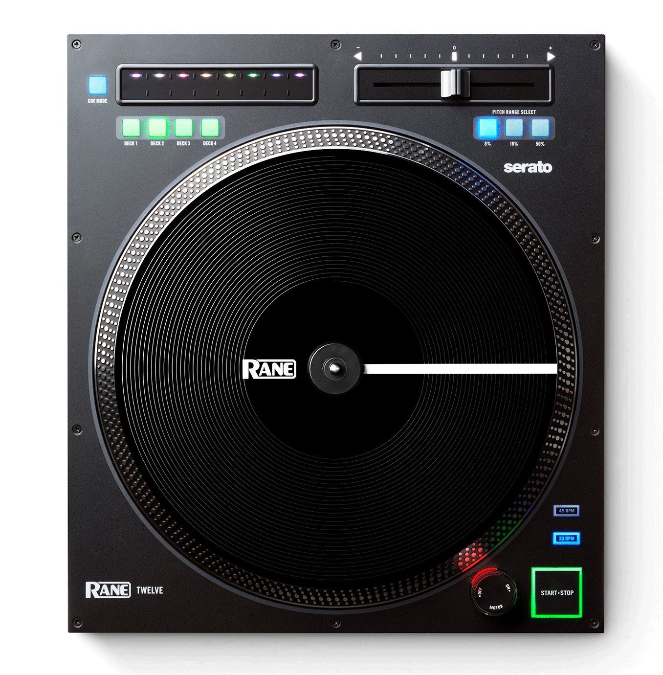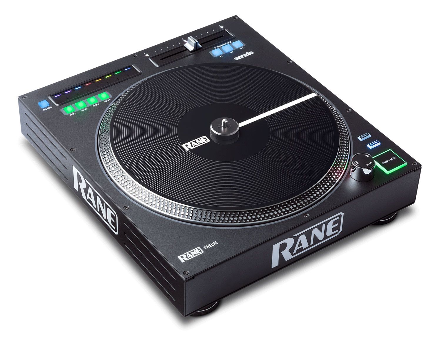 DJ-контроллер Rane DJ TWELVE представляет собой устройство, которое позволяет выполнять сведение музыкальных композиций. Оснащается фирменным программным обеспечением и MIDI-интерфейсом, что позволяет подключать устройства к компьютеру. Контроллер позволяет создавать имитацию игры на виниловой пластинке. Возможна работа как на высоком, так и низком крутящем моменте. Старт за 0,4 секунд.