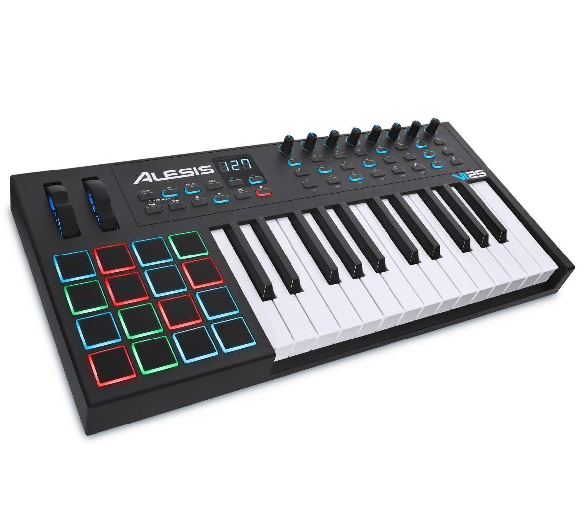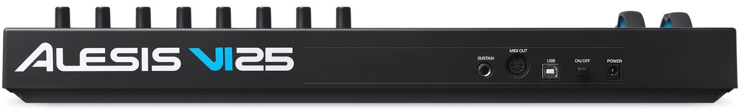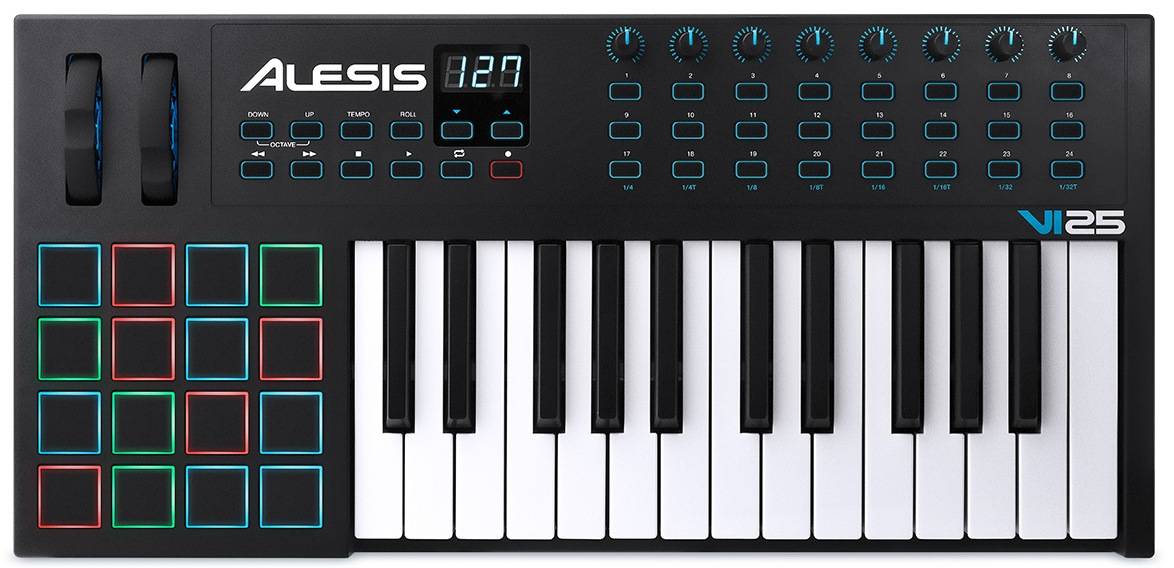 Midi-клавиатура Alesis VI25 имеет 25 полноразмерных клавиш с функцией послекасания. Для работы и создания музыки есть 16 пэдов, чувствительных к скорости нажатия со светодиодной подсветкой, 8 ручек (назначаемые) и 24 кнопки (назначаемые). Также есть кнопки повышения и понижения октавы, колесо тона и модуляции. Питание клавиатуры осуществляется через USB порт.