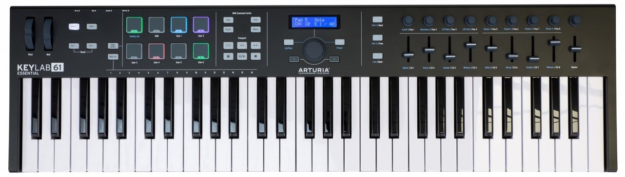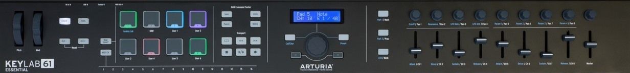 61 клавишная MIDI клавиатура, ПО Analog Lab 2, Ableton Live Lite, UVI Grand Piano, LCD дисплей, 1 clickable энкодер, 9 вращательных энкодеров, 9 фейдеров, 8 RGB пэдов, колеса Pitch&Modulation, 1/4" Jack вход педали сустейна, MIDI Out, USB