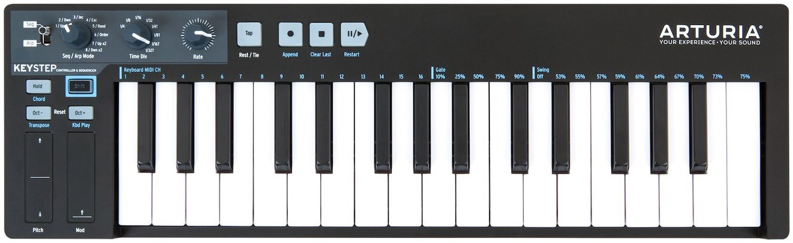 slim-клавиши с функцией aftertouch, чувствительные к скорости нажатия; - арпеджиатор с 8-ю режимами и режим воспроизведения аккордов;