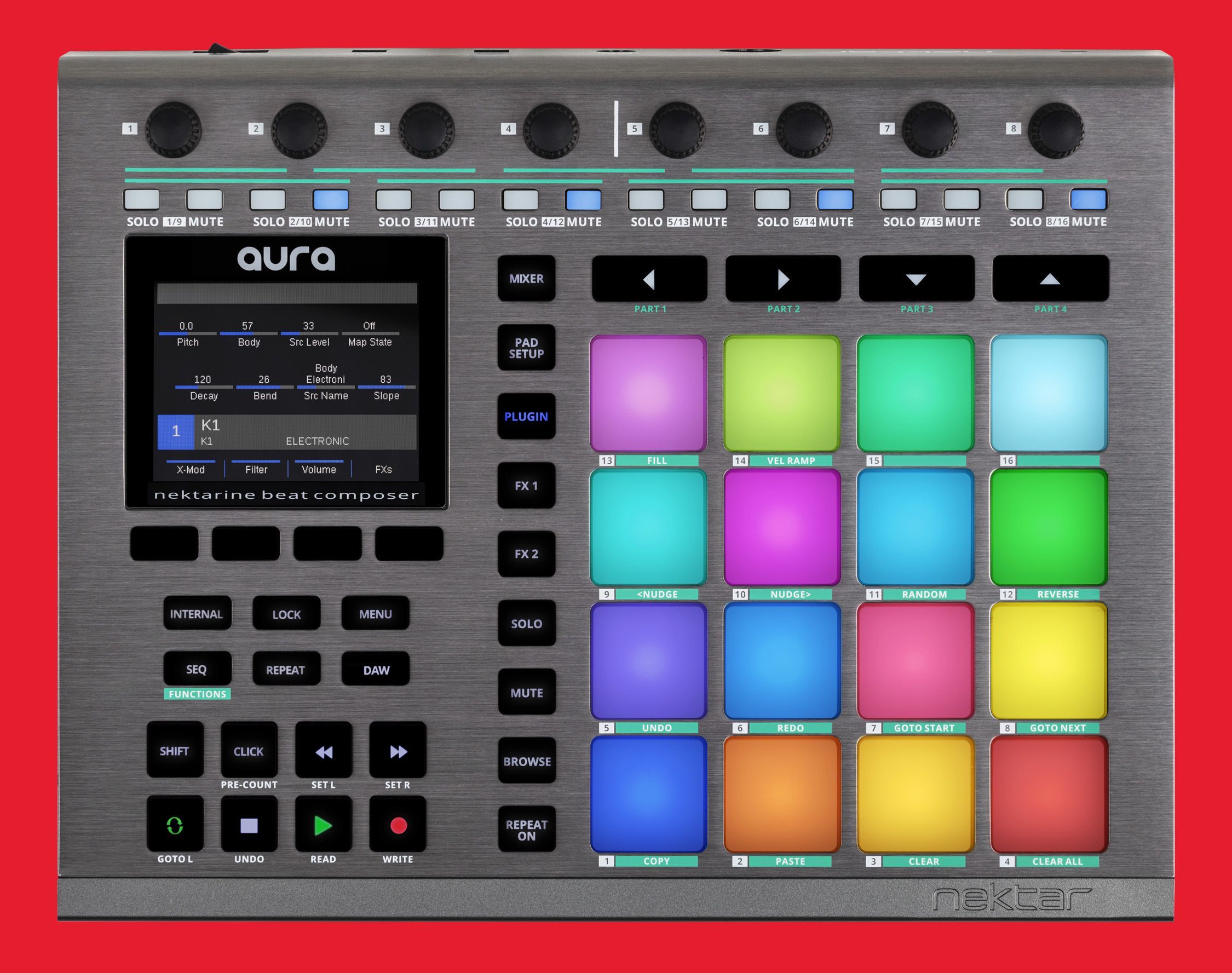 Nektar Aura - универсальный USB MIDI контроллер и мощный инструмент для живых выступлений и создания битов. 16 сверхчувствительных пэдов с RGB подсветкой, встроенный шаговый секвенсор, гибкий движок Pad Repeat и огромные возможности управления плагинами позволяют контроллеру привносить захватывающий драм-машинный стиль в работу с DAW или внешним MIDI сетапом. В паре с ПО Nectarin 2.0 устройство становится мощным центром управления плагинами. Nectarin способен работать с 16 плагинами одновременно, и каждый пэд Aura может управлять отдельным плагином. Любой пэд может быть переназначен на другой плагин с помощью создания слота и загрузки патча или плагина прямо с браузера устройства.