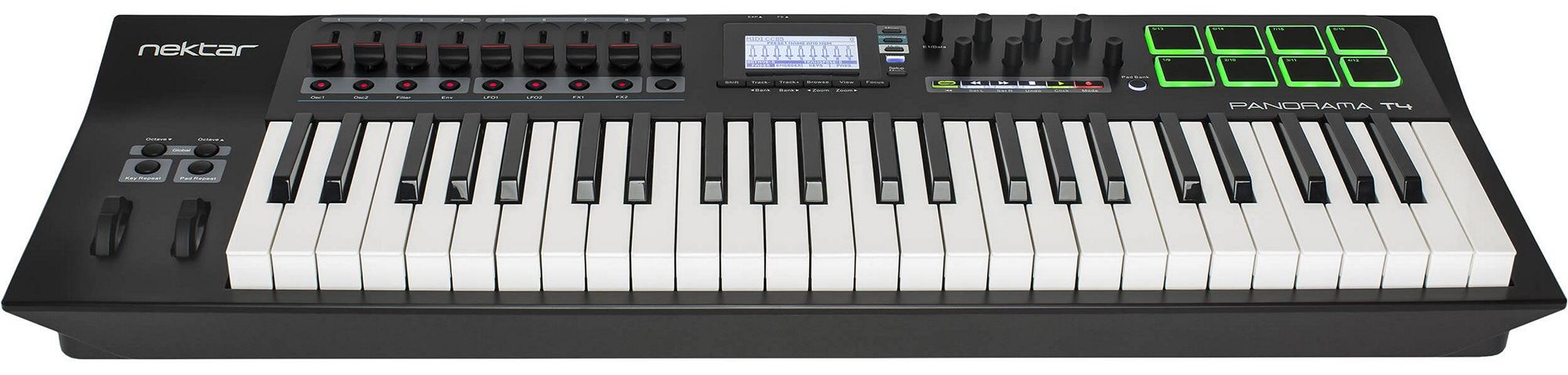 Nektar Panorama T4 – MIDI-клавиатура с синтезаторной механикой и 49 клавишами, обладающими чувствительностью к силе нажатия и послекасанием. На панели находятся еще 62 органа управления, включая колеса модуляции и питч, кнопки сдвига октавы, кнопки Key Repeat и Pad Repeat. Еще имеются девять 30-миллиметровых фейдеров, по восемь пэдов, чувствительных к силе нажатия и давлению, назначаемых кнопок со светодиодами и назначаемых энкодеров, шесть кнопок транспорта с подсветкой. Посередине расположен экран LCD (128x64 точек) с регулировкой контраста, функцией фокусировки и кнопками управления.