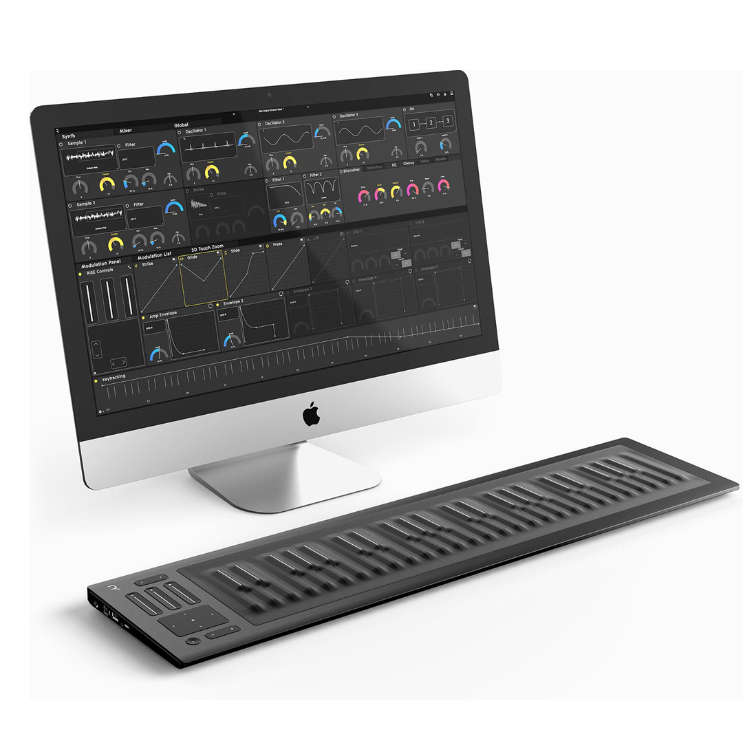 ROLI RISE 49 клавишный инструмент. Клавишный инструмент c фирменным программным обеспечением Equator, 49 силиконовых клавиш, сенсорные X/Y контроллер, 3 сенсорных контроллера, кнопки переключения октав.