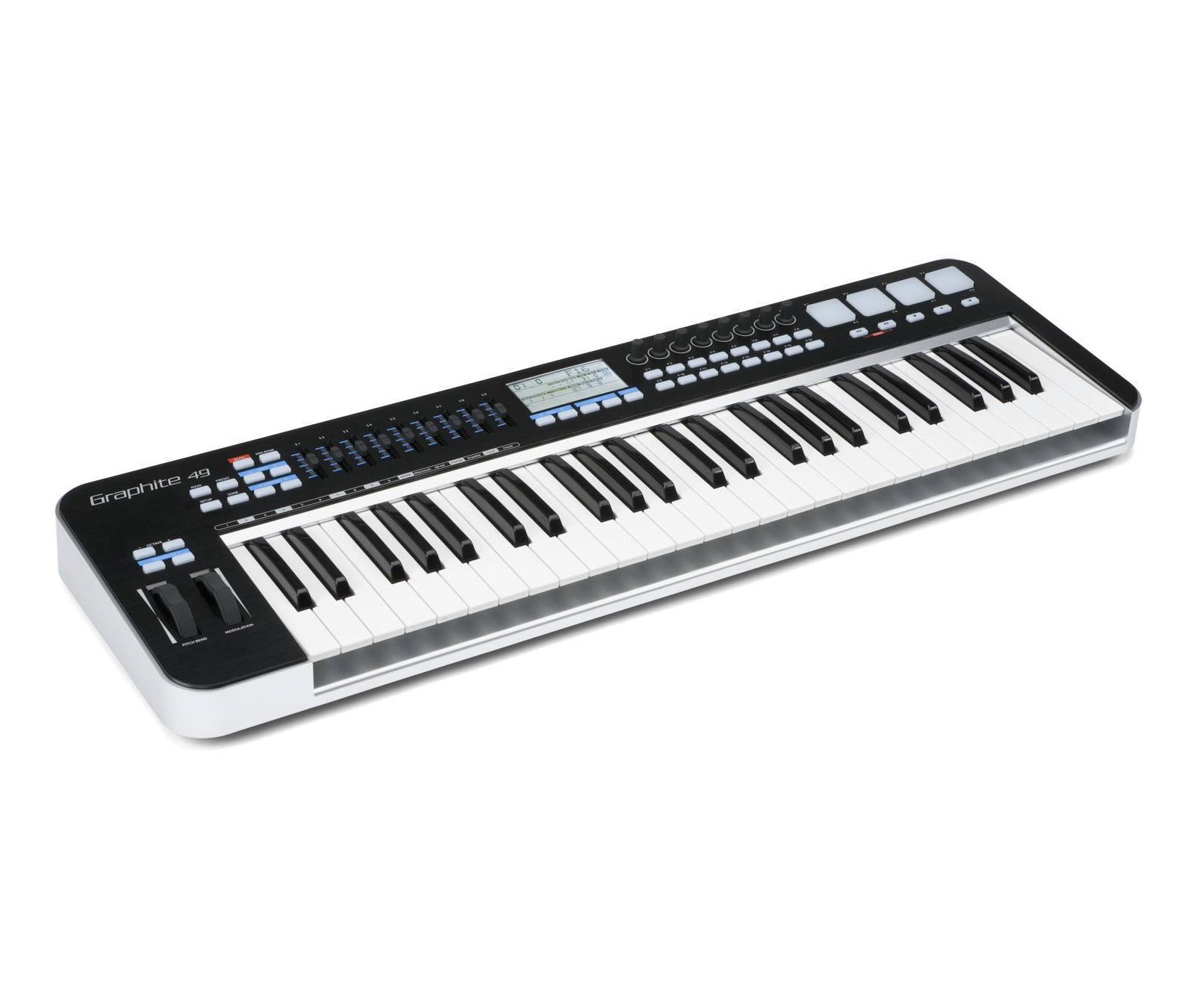 Samson Graphite 49 - это MIDI-контроллер, имеющий 49 полу-взвешенных клавиш, чувствительных к скорости нажатия, что позволяет точно передавать динамику игры. Средства управления цифровой рабочей станцией и виртуальными инструментами включают: девять фейдеров, восемь энкодеров и шестнадцать кнопок. Все органы управления можно настраивать и программировать без применения программы-редактора.