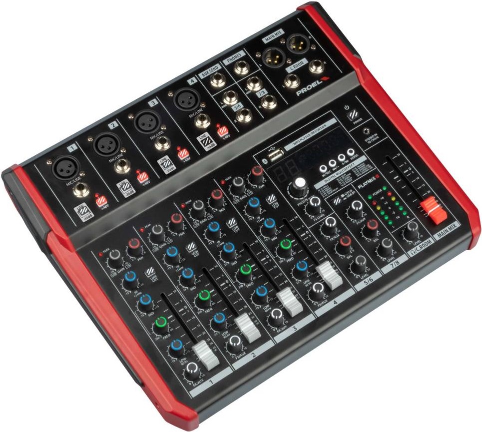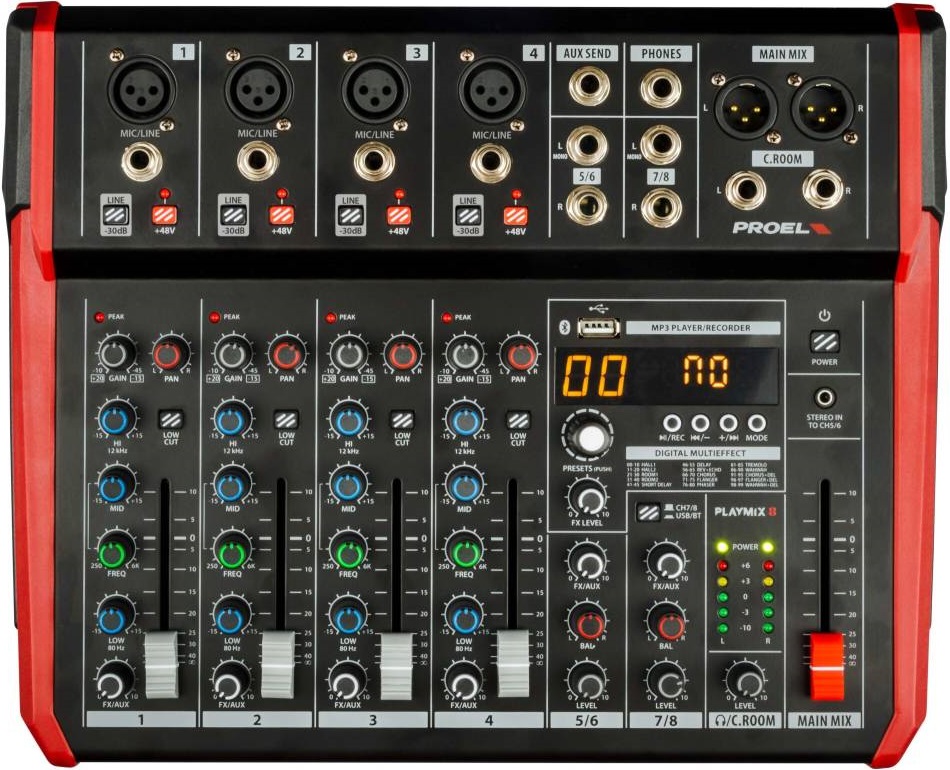 Proel Playmix8 - 8-канальный микшерный пульт с DSP-процессором, Bluetooth-модулем и встроенным мультимедийным плеером. Playmix - серия компактных и стильных микшерных пультов от компании Proel, обладающих полным набором необходимых функций и превосходным качеством звучания по очень выгодной цене. Тщательно разработанные и сконструированные в Италии микшерные пульты размещены в сверхпрочных металлических корпусах, обеспечивающих повышенную надежность для использования в суровой концертной и прокатной деятельности. Моноканалы MIC/LINE оснащены малошумящими микрофонными предусилителями с большим запасом мощности, 3-полосным эквалайзером с разверткой средних частот и HPF, а также 60-мм фейдерами управления для полного контроля над звуком. Все модели серии PLAYMIX оснащены информативным ЖК-дисплеем, высококачественным 24-битным встроенным процессором DSP со 100 студийными пресетами, стерео USB-аудиоинтерфейсом 48 кГц для записи/воспроизведения через ПК, встроенным MP3-плеером с возможностью подключения USB-накопителя и Bluetooth.