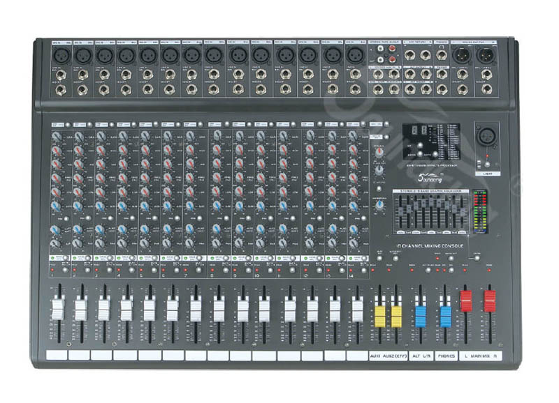 Фантомное питание 48В. Hi/mid/low эквалайзер для каждого канала. Графический эквалайзер 2?9. Система освещения для работы в темноте. Встроенный процессор цифровых эффектов (32 эффекта). Высокая точность индикации уровня. Микрофонный вход: 14. Линейный вход Stereo-AUX: 4. Tape in вход: 2. Стерео выход Main: 2. Стерео выход ALT: 2. Стерео выход CTRL Rom: 2. Выход EFF AUX: 2. Выход Tape: 2. Усиление: 70дБ. Частотный отклик: 20Гц-20кГц ±1дБ. Эквивалентный входной шум: -125дБ, невзвешенный. Выходной уровень: Max.+26дБ (балансный), Max.+22дБ (небалансный). Эквалайзер: LF: ±15дБ 100Гц, LM: ±15дБ 350Гц-5кГц, HF: ±15дБ 10кГц. Графический эквалайзер, центральные частоты: 63Гц, 125Гц, 250Гц, 500Гц, 1кГц, 2кГц, 4кГц, 8кГц, 16кГц. Уровень искажений: ?0.01дБ% (20Гц-20кГц). Размеры (мм): 590x410x110. Вес: 17 кг.