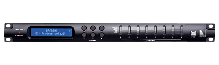 DPA880T - высокопроизводительная цифровая звуковая матрица с 8 входами и 8 выходами. Разработанная в первую очередь для систем аудиоконференций, матрица включает в себя все аудиопроцессы и управление, необходимые для использования в других приложениях с фиксированной установкой. Он включает в себя 8 индивидуальных переключаемых входов, таких как LINEA или MIC с фантомным питанием и 8 линейными выходами, все из которых управляются мощным DSP вместе с высокопроизводительными 24-битными AD / DA-преобразователями. DPA880T поддерживает режим «маршрутизации», в котором входы могут быть маршрутизированы / смешанны в любом выходе. Каждый входной канал Mic / Line обеспечивает фильтрацию верхних частот и низких частот первого порядка, 3-полосный параметрический эквалайзер, функцию Noise Gate и контроль усиления. Кроме того, микрофонные входы включают в себя функцию обратной связи, основанную на мощном алгоритме «сдвиг высоты тона», особенно подходящем для «голосовых» приложений. Каждый выход предлагает до 5 диапазонов параметрического выравнивания, фильтры кроссовера от 6 до 24 дБ на октаву, RMS-компрессор, Peak Limiter и программируемую задержку. DPA880T можно подключить через USB, Ethernet или RS485 для удаленной настройки и управления, используя специализированное программное обеспечение для ПК, которое также позволяет устанавливать все параметры и отображение всех уровней в реальном времени. Кроме того, матрица также может управляться устройством Apple iPad® с использованием специального программного обеспечения DPA880xT, которое позволяет осуществлять вмешательство во все параметры управления и управления. Для применения в сложных системах матрица также предоставляет 8 цифровых портов IN / OUT (GPIO) для интеграции с другими устройствами. Наконец, DPA880T можно подключить через соединение RS485 к дополнительной панели управления настенной панелью CP4, которая позволяет выбирать 4 назначенных предустановки и регулировку громкости
