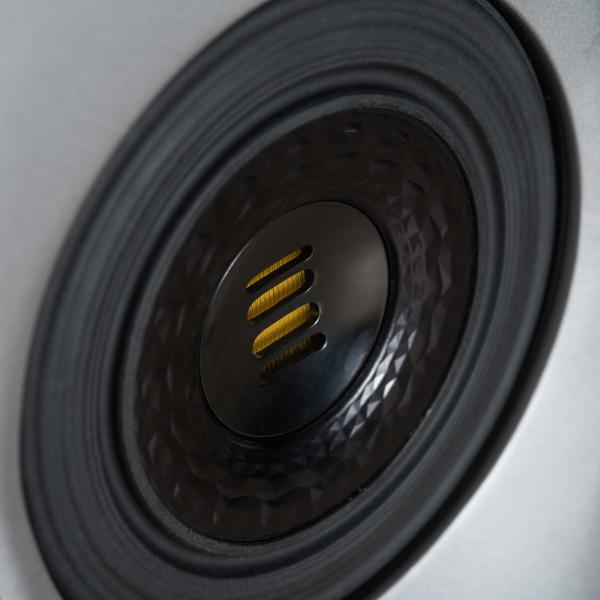 Твитер JET 5 обладает тонкой легкой ленточной мембраной, быстро реагирующей на поступающий сигнал, что позволяет получить очень точный саунд с минимумом искажений, а также поднять диапазон до 50000 Гц. Диффузор СЧ-излучателя получил название “Crystal Membrane” благодаря рельефной поверхности, напоминающей большой кристалл. Маркировка диффузора “AS-XR” указывает на расширенный динамический диапазон (XR — extended range), а также на двухслойную структуру (ультратонкий алюминиевый купол, присоединяется к картонному конусу с помощью клея). При этом звуковая катушка имеет отдельное соединение с куполом из алюминия и с конусом из бумаги. В итоге удается получить жесткую конструкцию, которая подавляет паразитные резонансы и обеспечивает широкий динамический диапазон.