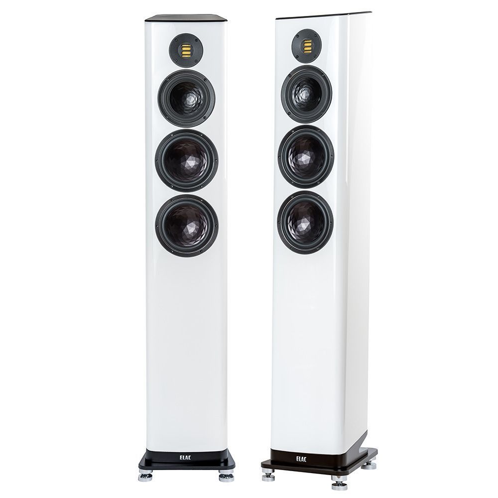 Модель оснащена ленточным твитером JET V. Сверхлегкая ленточная мембрана обеспечивает мгновенную реакцию на получаемый сигнал, что выражается в высокой точности звучания. Еще одно преимущество такого твитера заключается в очень широком частотном диапазоне с верхним пределом в 50 кГц. Такой впечатляющий показатель позволяет в полной мере раскрыть потенциал любых Hi-Res-записей. Высокочастотный излучатель помещен в специально рассчитанный неглубокий волновод, благодаря чему улучшаются дисперсионные характеристики, а звучание становится более четким и открытым. Компания ELAC обращает внимание на то, что все излучатели колонки были специально оптимизированы, что выразилось в улучшении переходных характеристик. В качестве среднечастотника используется 150-миллиметровый динамик, а бас передается с помощью пары 180 мм вуферов. Динамики используют особые диффузоры-«сэндвичи» AS-XR, в которых задействовано бумажное основание и тонкий внешний алюминиевый купол с напоминающей обработанный алмаз рельефной текстурой. К куполу и основанию подсоединена звуковая катушка. С помощью такой легкой и жесткой конструкции удается эффективно подавлять любые резонансы, а также избавиться от нежелательной деформации поверхности диффузора. Динамический диапазон у СЧ-драйвера при этом повышается на октаву. Повысить жесткость и минимизировать вибрации помогают литые алюминиевые корзины динамиков.