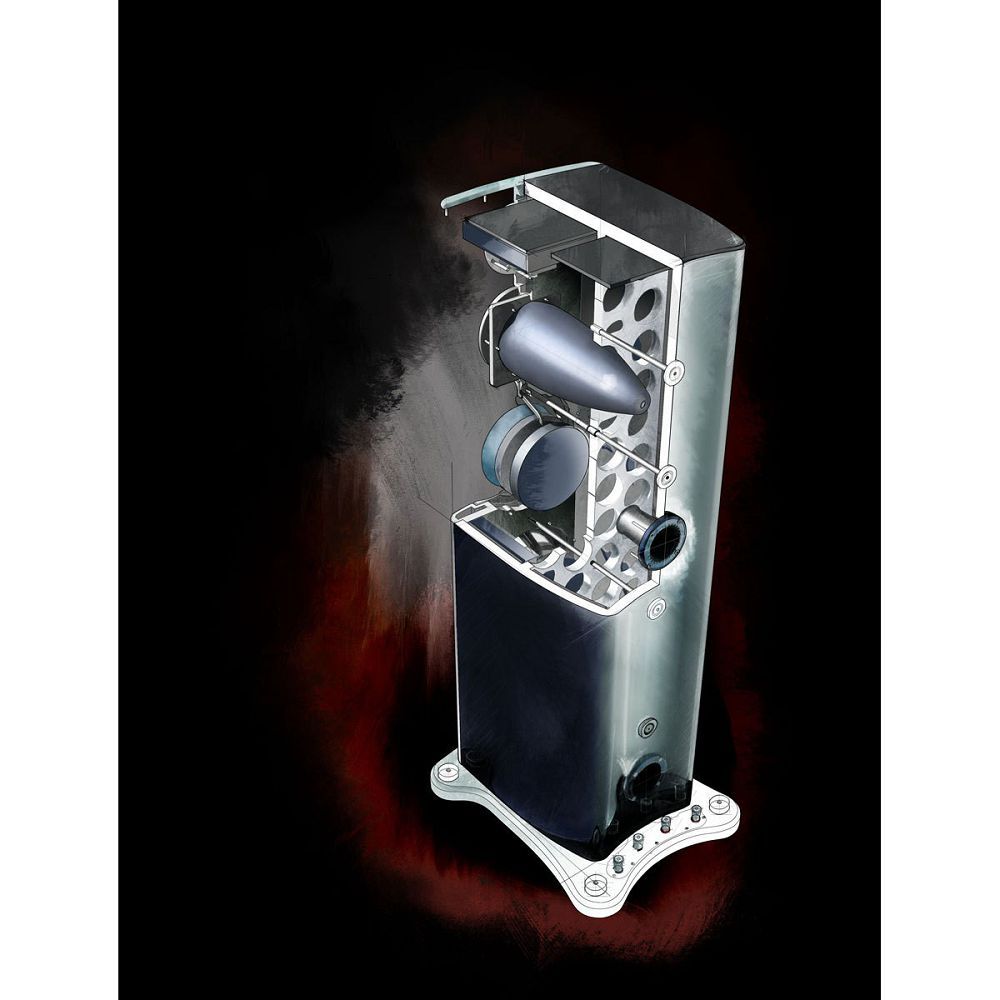 В верхней части фасада установлен блок с 4" СЧ-драйвером и инновационным твитером MPD (Micro Pleated Diaphragm), оснащенным сверхтонкой гофрированной мембраной-лентой, которая поднимает АЧХ вплоть до 100 кГц. Ниже находится пара 8-дюймовых вуферов. Среднечастотник изолирован в закрытом коническом футляре TLE, изготовленном из материала ARC (антирезонансный композит). Футляр препятствует формированию внутренних стоячих волн и паразитных резонансов. Материал ARC также используется при изготовлении передней панели АС.