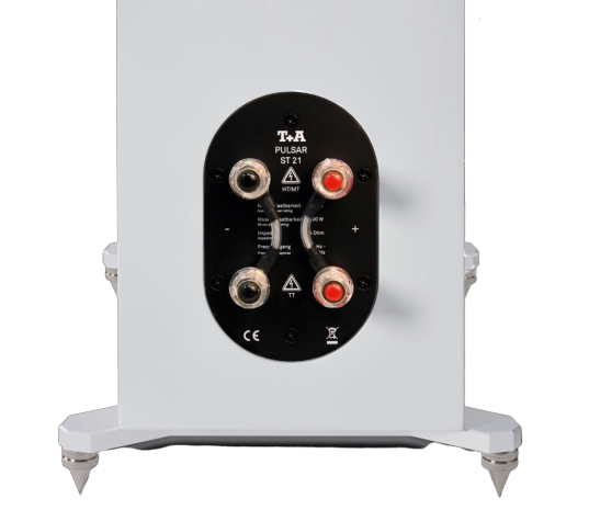 Трехполосная акустическая система Т+А Pulsar ST 21.Диапазон частот 32–30 000 Гц, чувствительность 88 дБ, импеданс 4 Ома, номинальная мощность 140 Вт, максимальная музыкальная – 200 Вт. Драйверы: два басовика 152 мм, СЧ-динамик 120 мм, твитер 25 мм. Частоты разделения кроссовера – 300 и 2000 Гц.