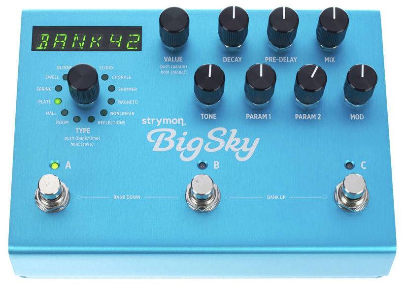 - Strymon Big Sky - педаль эффектов реверберации. BigSky предлагает 12 видов реверберации студийного класса: Room, Hall, Plate, Spring, Swell, Bloom, Cloud, Chorale, Shimmer, Magneto, Nonlinear и Reflections.
