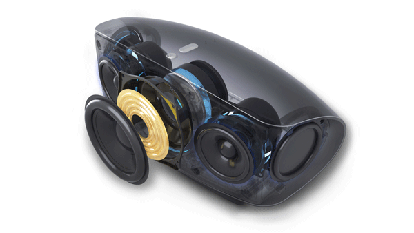 - Динамики: 1 x 3,5” низкочастотный динамик с большим смещением ; 2 x 3” сбалансированные бас-радиаторы ; 2 x 2,5” широкополосные динамики с неодимовыми магнитами