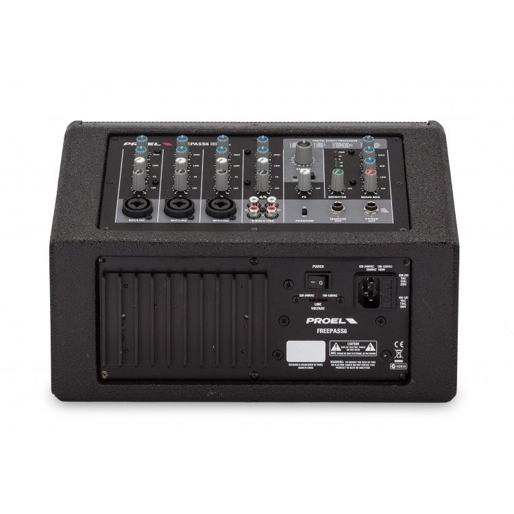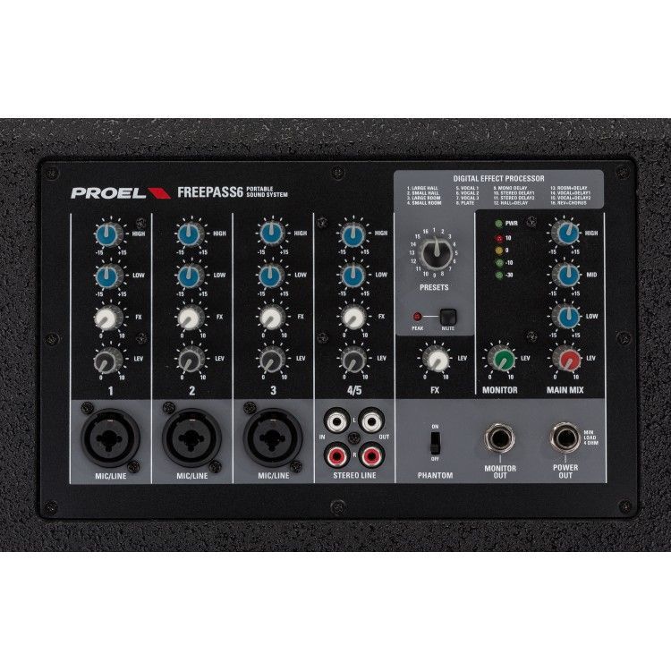 Proel FREEPASS6 2-полосная портативная активная АС с 5-канальным микшером и процессором эффектов Мощность: 75 Вт. Микшер: 2 входа mic/line моно + 1 line стерео, мониторная линия.