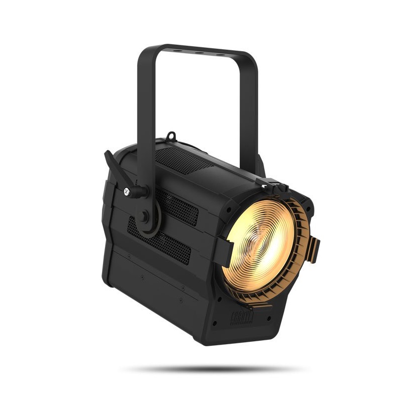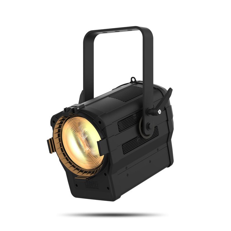 светодиодный прожектор направленного света с линзой френеля. 1х70Вт WW LED, 1/2/2/5 каналов DMX, моторизованный ZOOM, угол раскрытия 25-65град, температурность 3096К, яркость в 5м. зоне 1290лк с углом 25 (252 с углом 65), 4 режима эмуляции энертности ламп, регулируемый PWM, режим стробоскопа 0-30Гц, CRI=97, XLR 3+5pin, PowerCon IN+OUT, PowerLink до 38 приборов, универсальный блок питания 100-240В, потребление до 81Вт, вес 5кг, ДШВ 297х285х382мм.