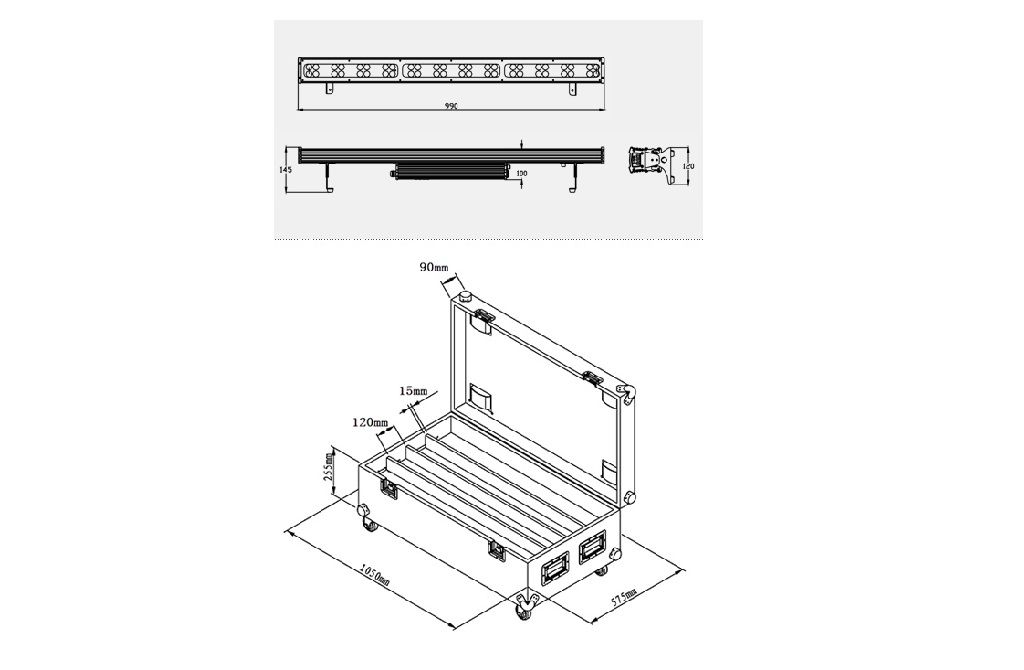 Прожектор, 48 белых светодиодов (12 cold white + 36 warm white). Электронный диммер 0-100%. Строб. Угол луча 25°. Управление: DMX512, звуковая активация, автоматический режим, master/slave. Питание: AC100-240V 50-60HZ. Габариты: 990*120*145 мм, вес:5,7 кг.
