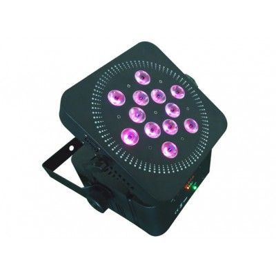 Прожектор, 12 высокомощных (15 Вт) 5-1 чиповых (RGBWA 3 Вт на каждый цвет) светодиодов. Угол луча 30°. Управление: DMX512, звуковая активация, автоматический режим, master/slave. До 5 часов автономной работы аккумуляторов. Питание: AC110-250V 50-60HZ. Потребление: 180 Вт. Размеры упаковки: 250 x 250 x 250 мм. Вес: 5.5 кг.