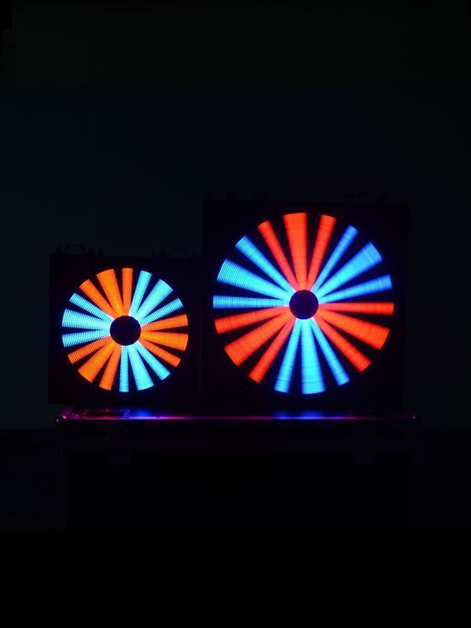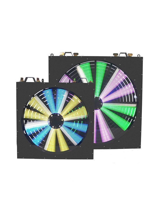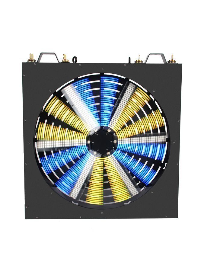LEDFAN500 Светодиодный эффект. 6 лопастей. Источник света 486 шт светодиодов RGB. 2 группы светодиодов (по 3 лопасти). Управление по DMX (4/8/11) каналов, автопрограммы. Вес 8 кг. Габариты 500 х 500 х 85 мм.