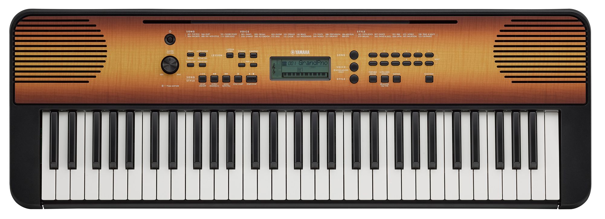YAMAHA PSR-E360 синтезатор с автоаккомпаниментом 61 клавиша,цвет Maple (клён),400 тембров, 130 стилей автоаккомпанимента, 3-ступенчатая программа обучения, работа от батарей (6 х АА), AUX-IN