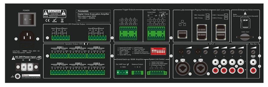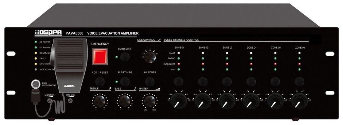 DSPPA PAVA-6500 Блок управления 6 зон. 500Вт/100В.Питание 220В/24В. Функции:аварийного оповещения от ОПС (зона/группа), контроль линий громкоговрителей; мониторинг сигнала, подключенных устройств (микрофонных консолей, PTT микрофона, встроенного и резервного усилоителя). Встроенный усилитель "D" класса. Управление с РС.
