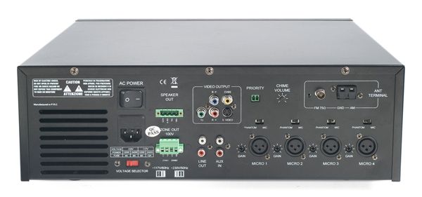 - Входы: 4x MIC/LINE (MIC1 with prority) 1x AUX 1x PRIORITY