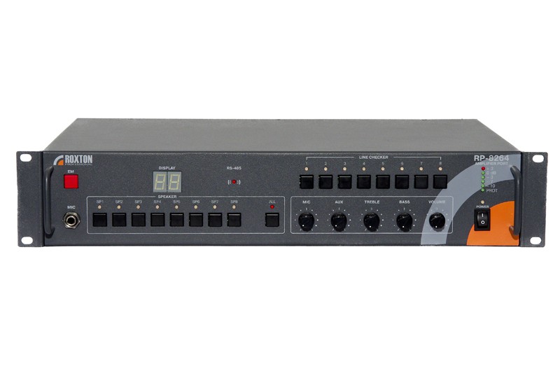Комбинированный преобразователь ROXTON RP-8264 (далее моноблок) работает в составе цифро-аналоговой системы оповещения ROXTON-8000. Представляет собой блок 19” исполнения, совмещающий в себе функции многоприоритетного предварительного усилителя, 8-ми зонного селектора/коммутатора 4-х внешних усилителей мощности на 8 линий громкоговорителей, блока автоматического контроля линий громкоговорителей и зарядного устройства.