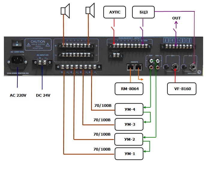 | Количество/мощность/напряжение внешних усилителей мощности | до 4-х, 500 Вт/100 В |
