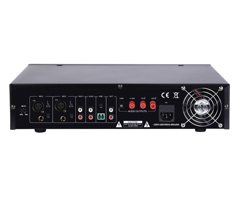- Три микрофонных входа, два AUX входа, один AUX выход